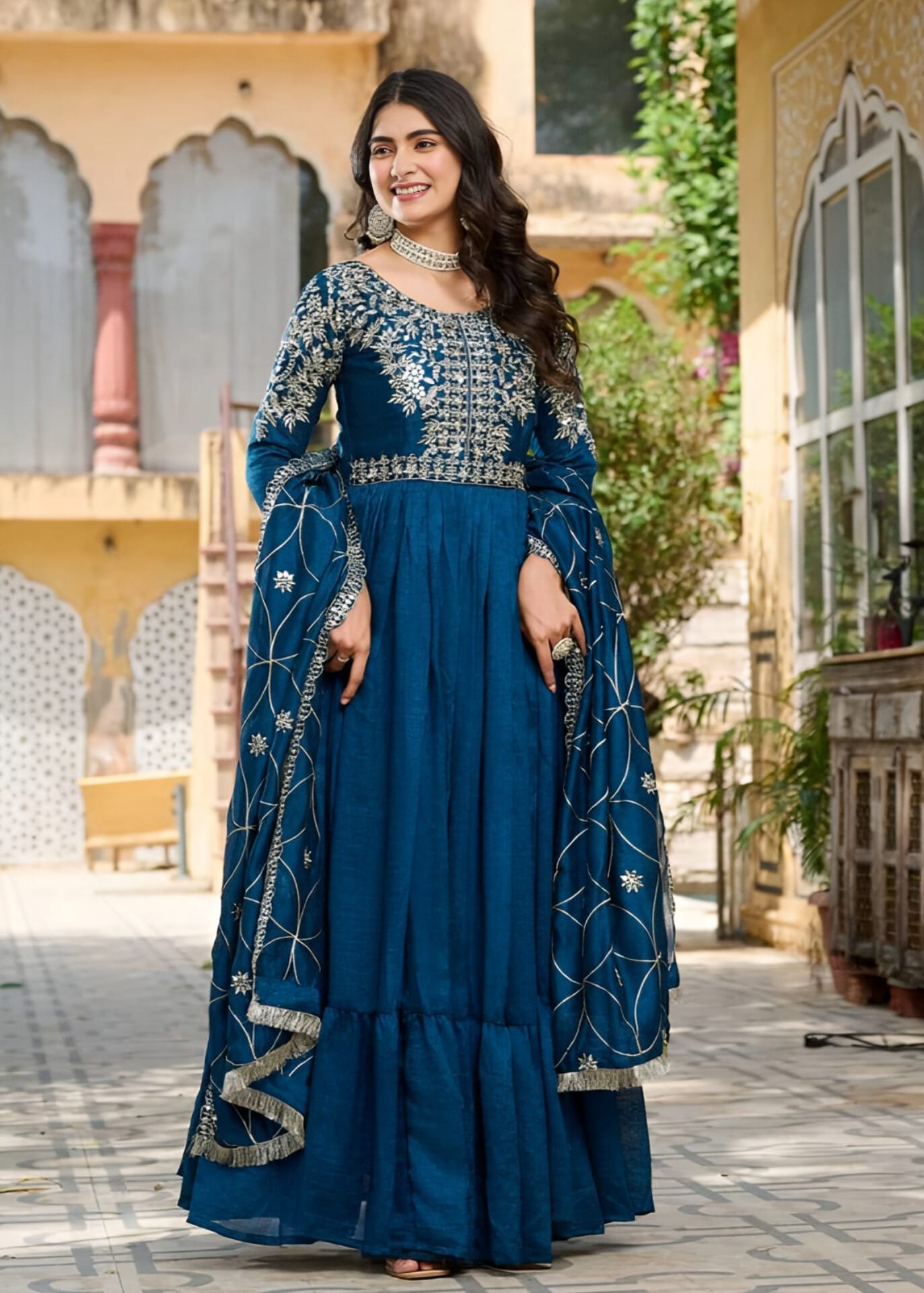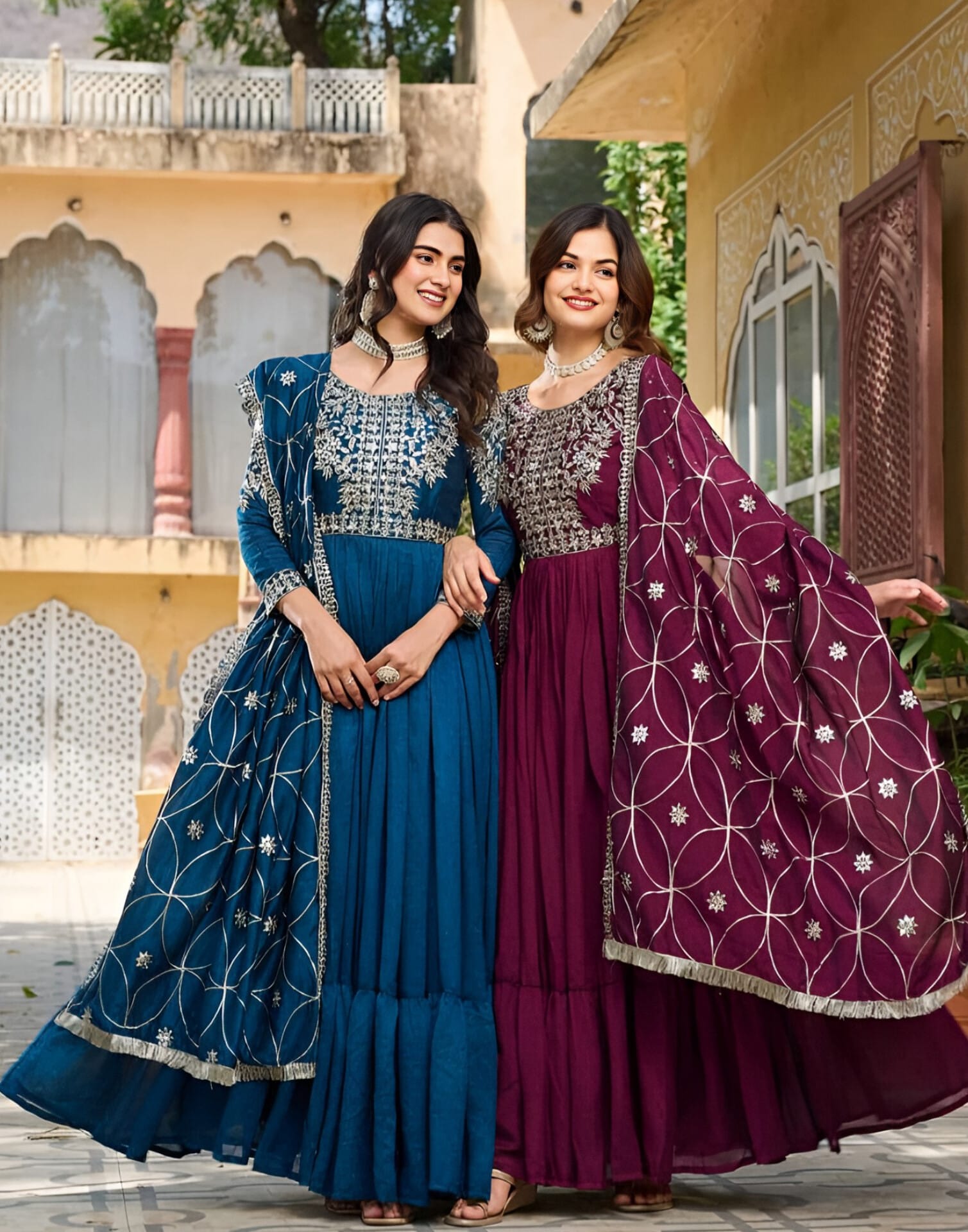 Gown : Vichitra Silk | Work : Sequence Embroidery Work | Inner : Micro Cotton | Flair : 5.00 Mtr | Dupata : Vichitra silk ( 2.30 Mtr )